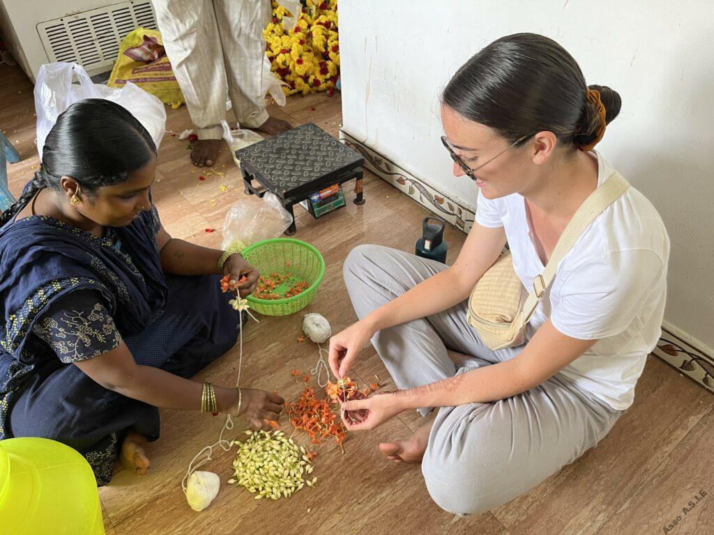 Lorsque les enfants étaient à l’école, j’ai eu la chance de découvrir différents villages avec M. Bharathi ou Ms. Anbu : temples, rivières, culture des fruits, des fleurs. J’ai notamment appris à confectionner des guirlandes de jasmin.