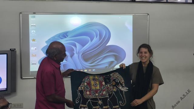 Élégante, maquillée avec finesse, éblouissante de beauté par ces nombreux bijoux, une danseuse et chanteuse de Bharata Natyam, danse spécifique du Tamil Nadu monte sur la scène de la grande salle de repas. Professionnelle, connue internationalement, accompagnée par son fils de 7 ans, joueur de tablas (tambours), Murugashankari nous présente l’histoire de cette danse, son parcours personnelle d’artiste, de Docteur en acupuncture et médecine traditionnelle avant d’interpréter de superbes danses et chansons.