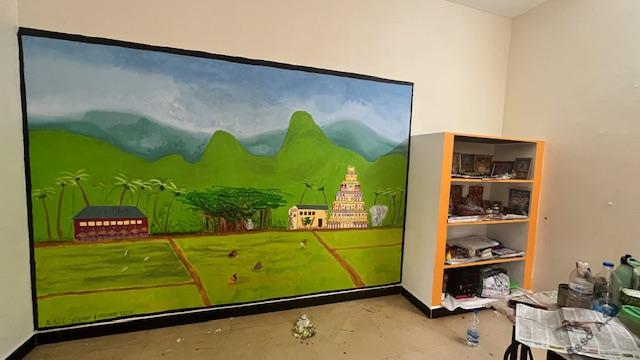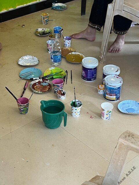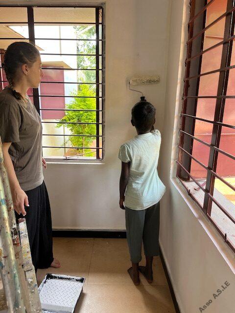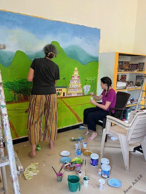 Le contour de la fresque est dessiné par 3 membres de la mission puis la fresque est peinte. Des enfants viennent aider et dans une joyeuse ambiance la pièce s’éclaircit grâce à la 2ème couche de peinture de couleur ivoire.