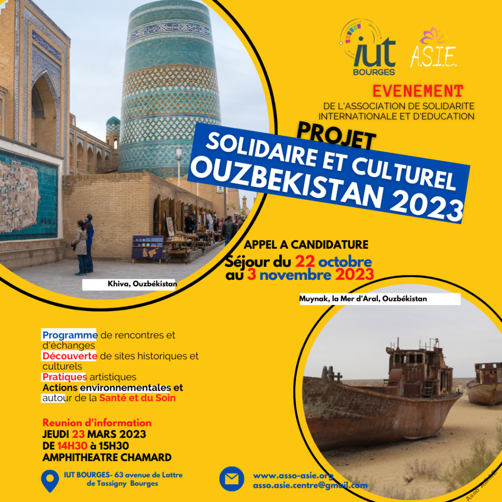 Après une première expérience en Ouzbékistan, l’association A.S.I.E souhaite entretenir ses relations avec différents partenaires Ouzbeks, notamment l’université d’agrotechnologie de Noukous. Un projet de plantation d’arbre a été mené l’année passée. L’Ouzbékistan est un pays très concerné par les problématiques environnementales, telles que la pénurie d’eau ou la gestion des déchets.