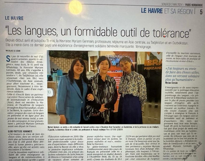 ASIE : Association de Solidarité et d’Éducation, est heureuse d’avoir parmi ses membres, Myriam Germain qui, en Ouzbékistan 🇺🇿, est très investie pour valoriser la langue, la culture française sur des sujets centraux comme les Objectifs du Développement Durable, le tourisme responsable, etc.
