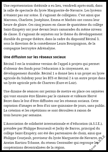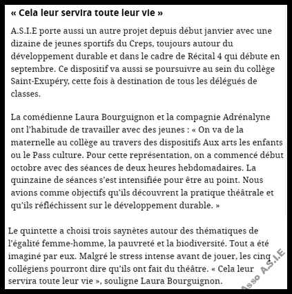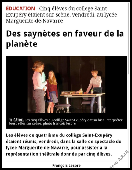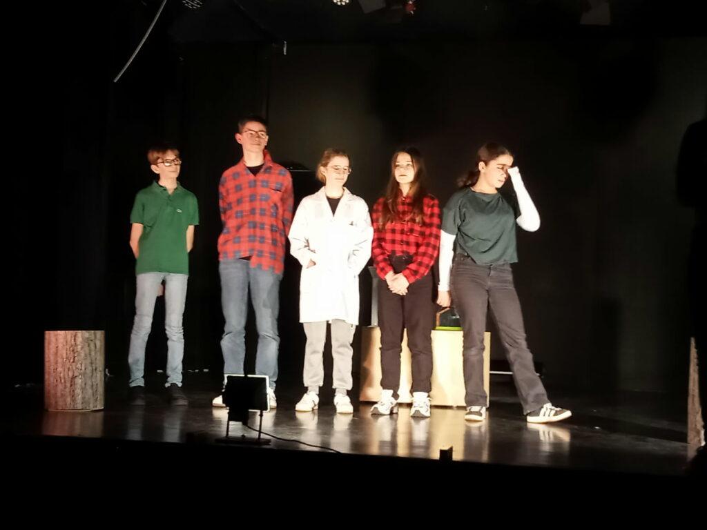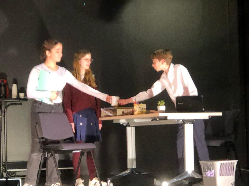 Parmi eux, 5 jeunes se sont engagés dans une production de saynètes de théâtre pour mettre en avant certains des 17 objectifs que 195 pays se sont fixés d’atteindre pour 2030. Égalité entre les hommes et les femmes, eau propre et assainissement, réduire la pauvreté, etc., ont été au cœur des saynètes. Sous la direction de la comédienne et metteure en scène, Laura Bourguignon, de la Compagnie Adrénalyne, ils ont écrit, mis en scène et interprété leurs saynètes vendredi 28 février devant leurs camarades de 4ème.